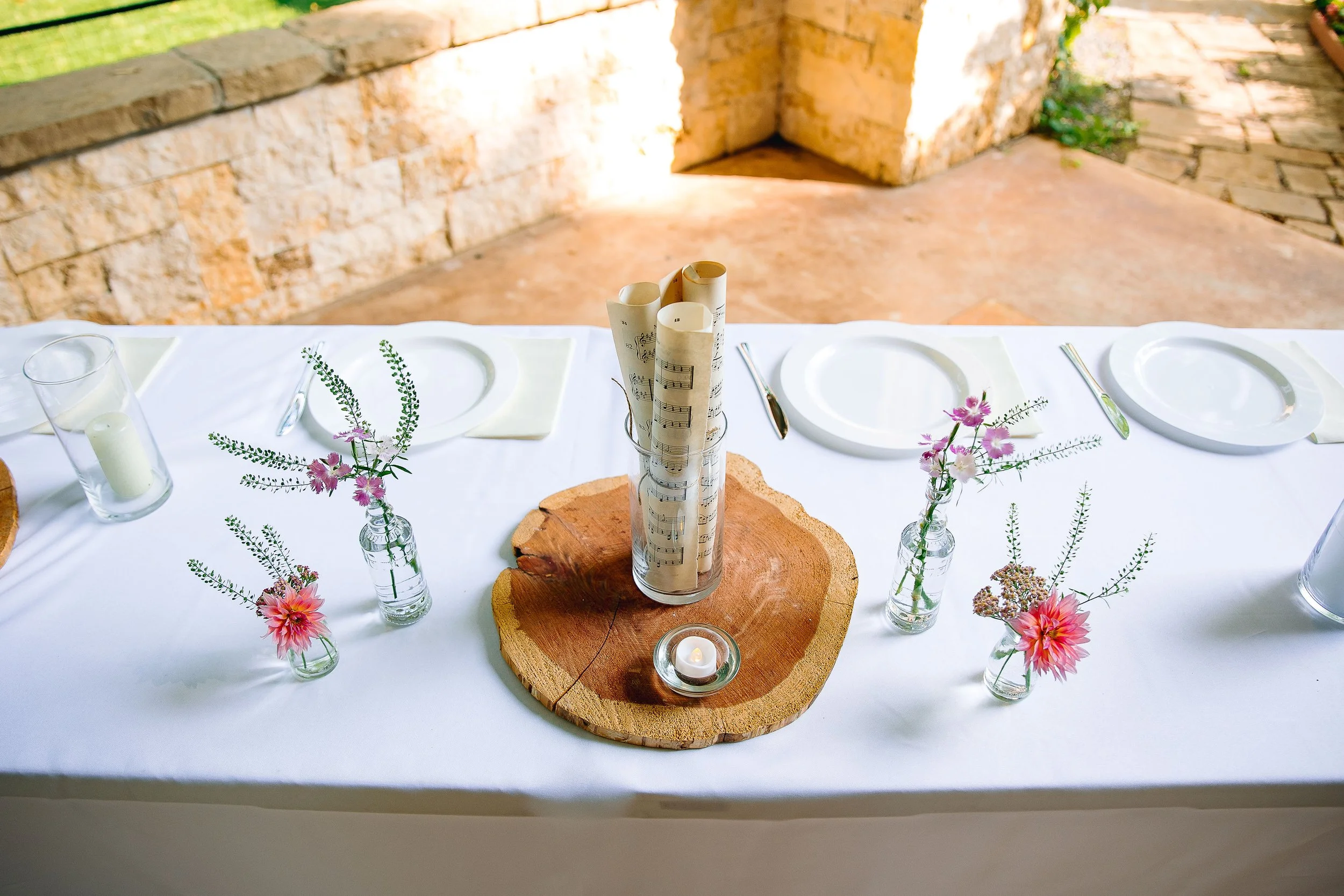 After the ceremony, guests enjoyed a delicious Mediterranean dinner at the covered reception area. The tables were set with a runner made from sheet music, glass hurricanes with candles inside, and bud vases filled with whimsical flowers scattered in between.